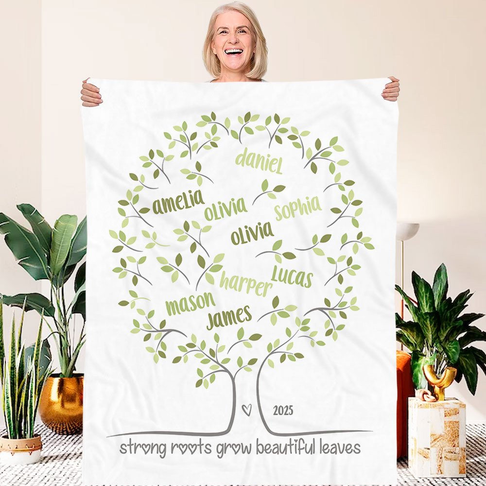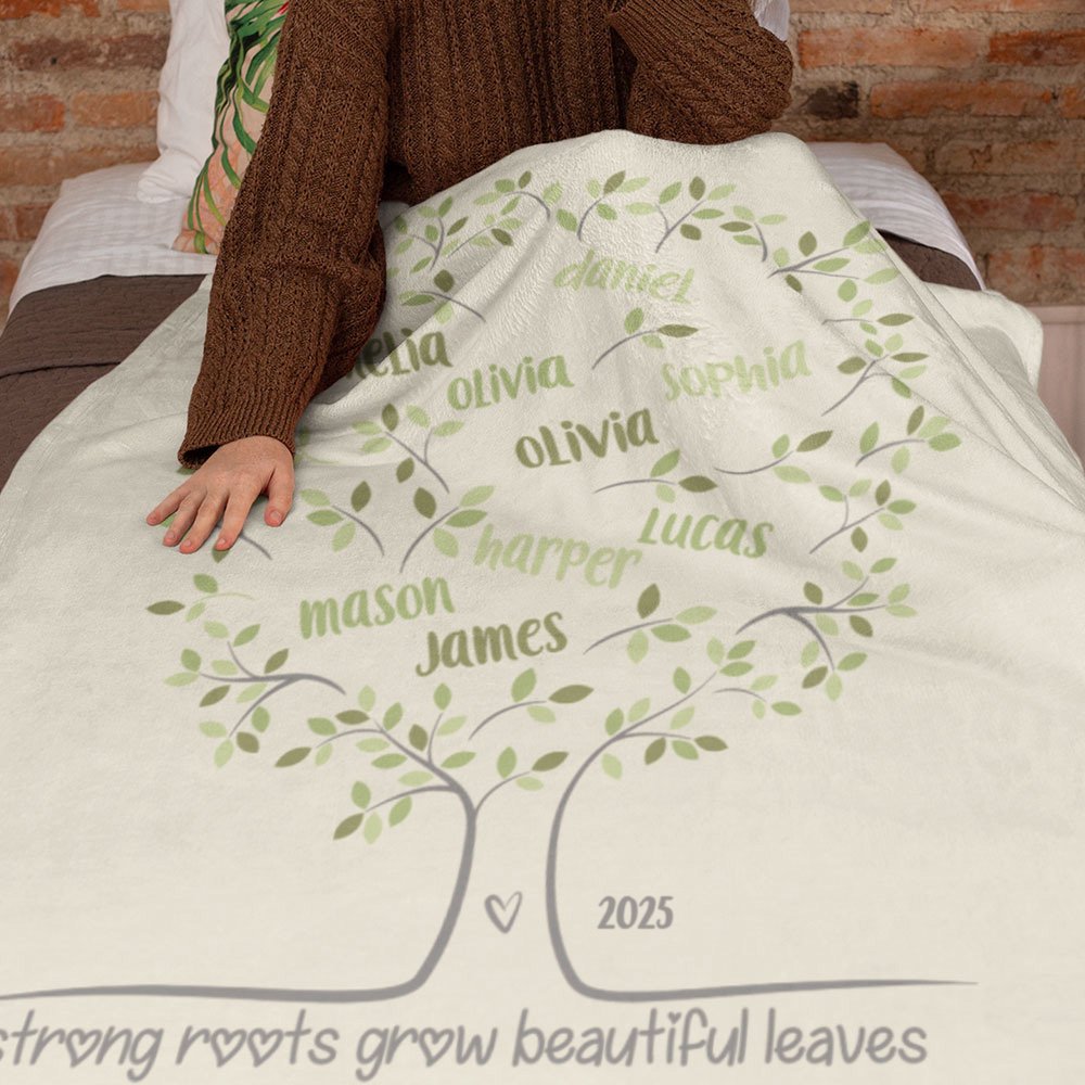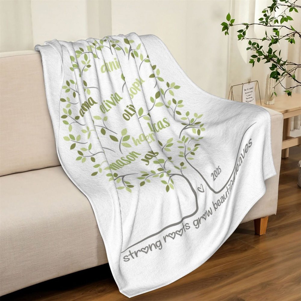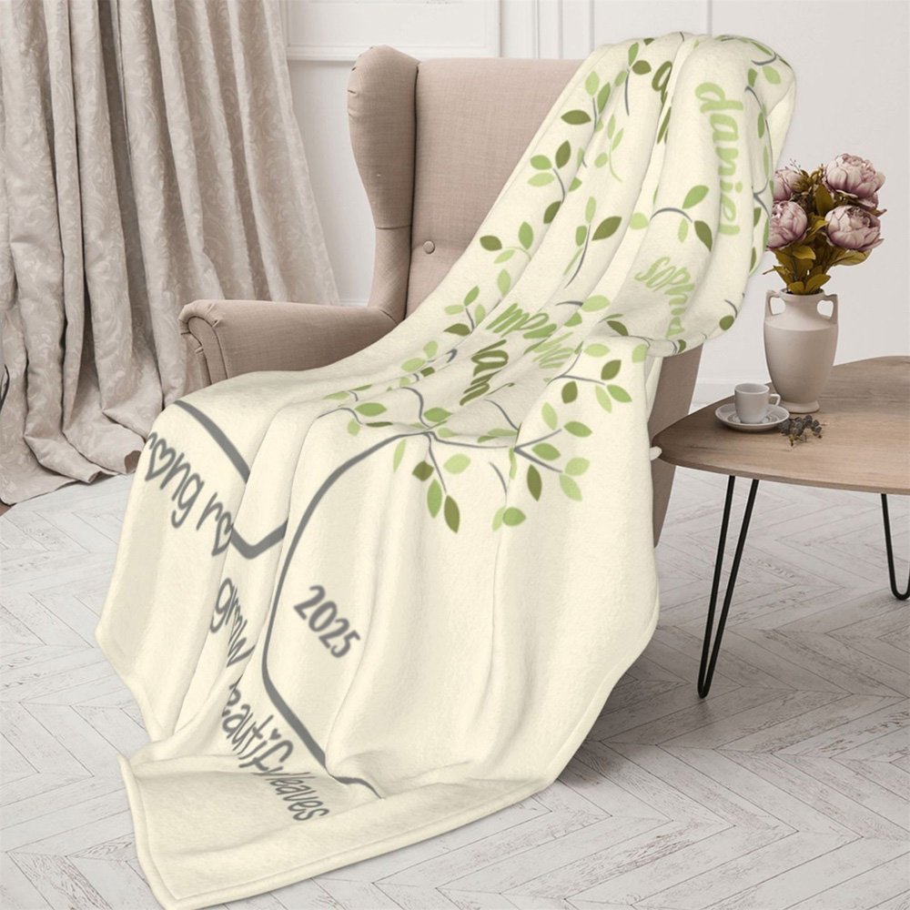 This blanket features a family tree design that displays the names of your family members on the beautiful blanket. You can choose the number of names based on the number of family members. The green tree of life represents your extended family, and each branch represents its members. From root to leaf, it tells the story of your shared history and the love passed down from generation to generation.