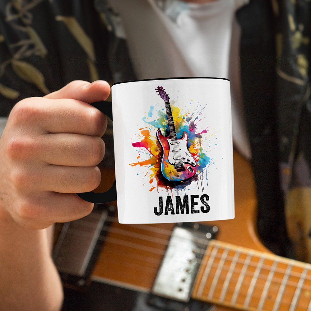 Personalised Colourful Splash Ink Guitar Theme 11oz Ceramic Mug with Name and Handle Birthday Gift for Guitar Players Lovers