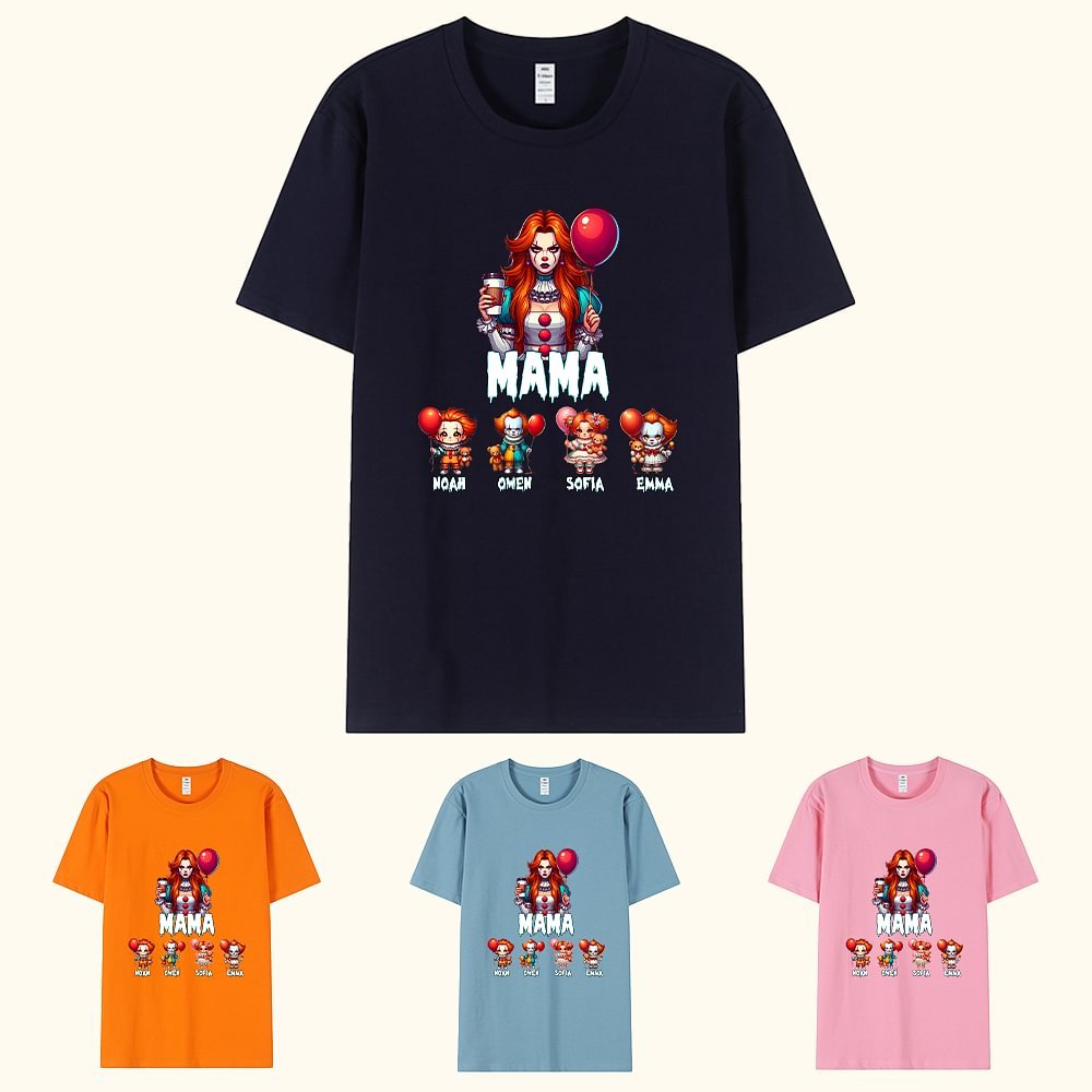 This t-shirt or sweatshirt features a fun "Horror Mom" theme, perfect for embracing the spooky spirit of Halloween. Customize it with the names and images of 1 to 4 children, making it a standout piece that showcases your family’s personality during the festive season.