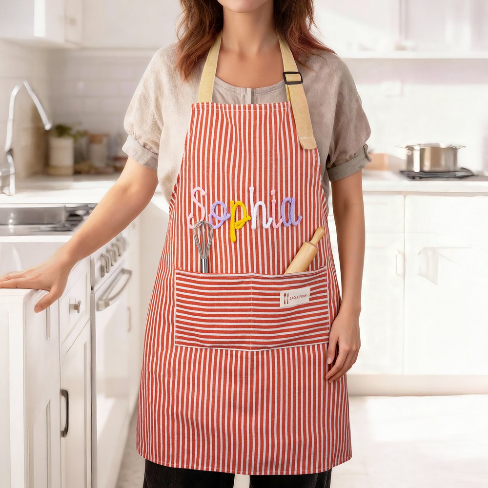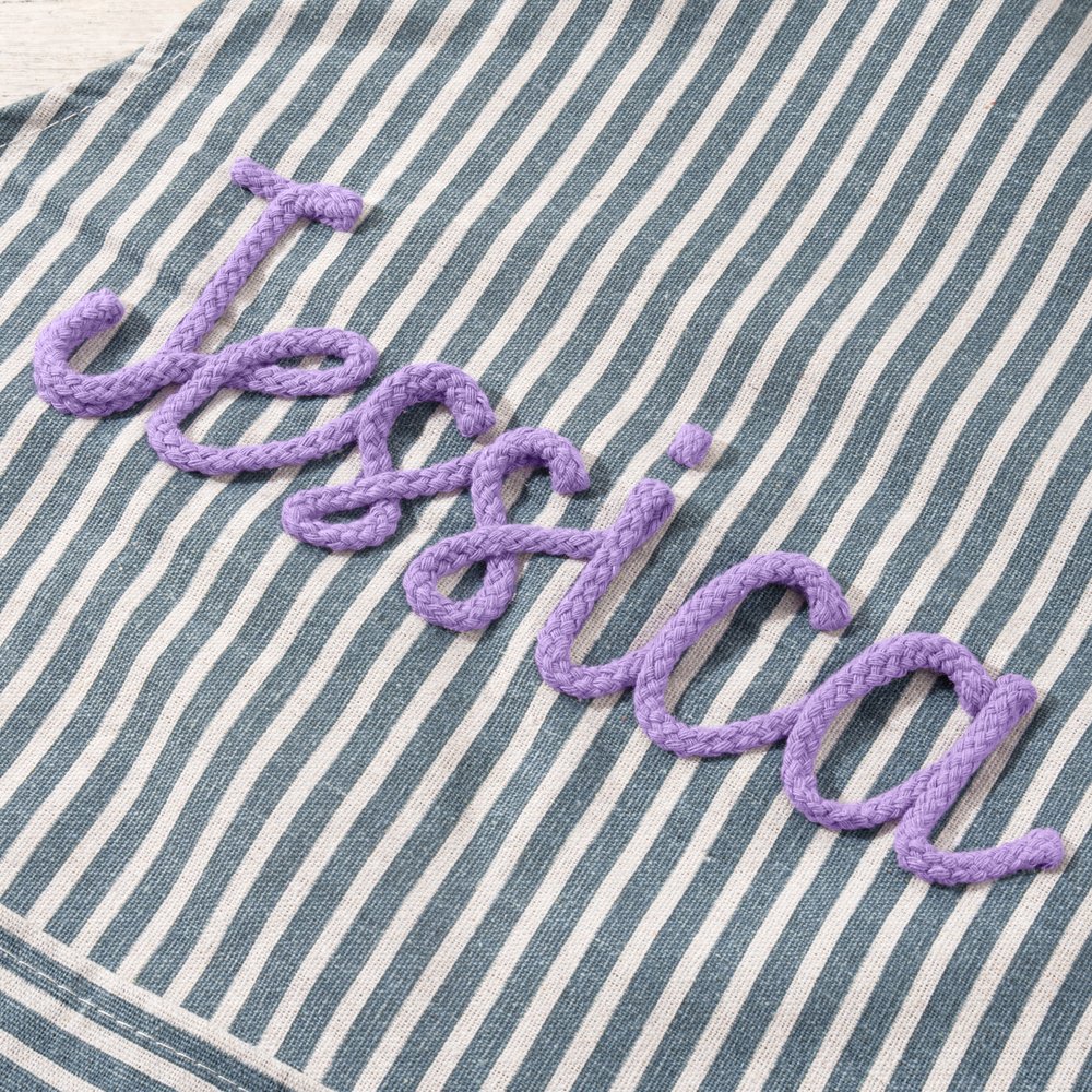 This apron boasts a charming design with vibrant striped patterns to add style to daily tasks. Its standout feature is the custom hand-woven name, letting you personalise with favorite yarn colours for a unique, individual look. There's also a practical front pocket for easy access to small items, blending fashion and functionality perfectly.