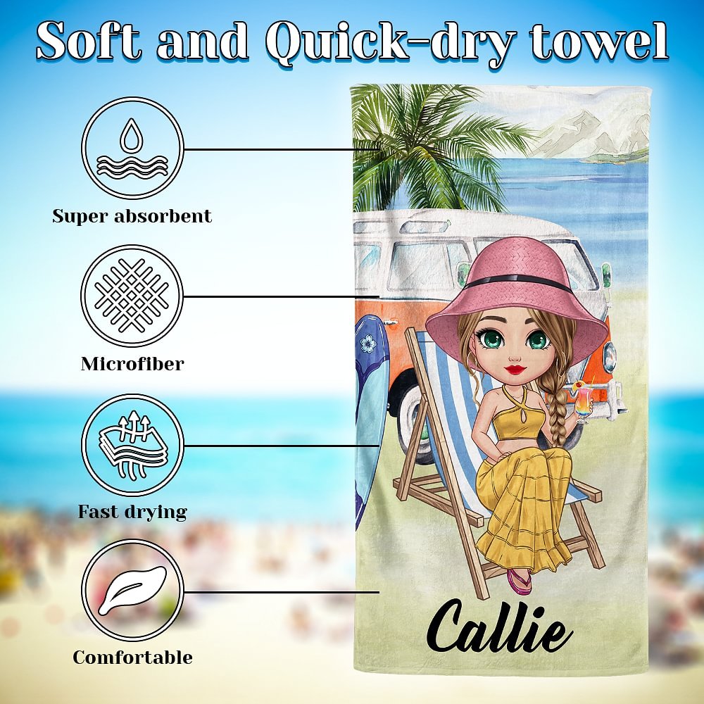 Our beach towel features a charming coconut tree and beach scene as its background, incorporating elements like surfboards and buses to create a strong summertime vibe. The towel can be customized with cartoon characters representing different genders and age groups, and you can choose from multiple fonts to add personal touches such as names or nicknames, making it your very own unique and exclusive beach towel.
