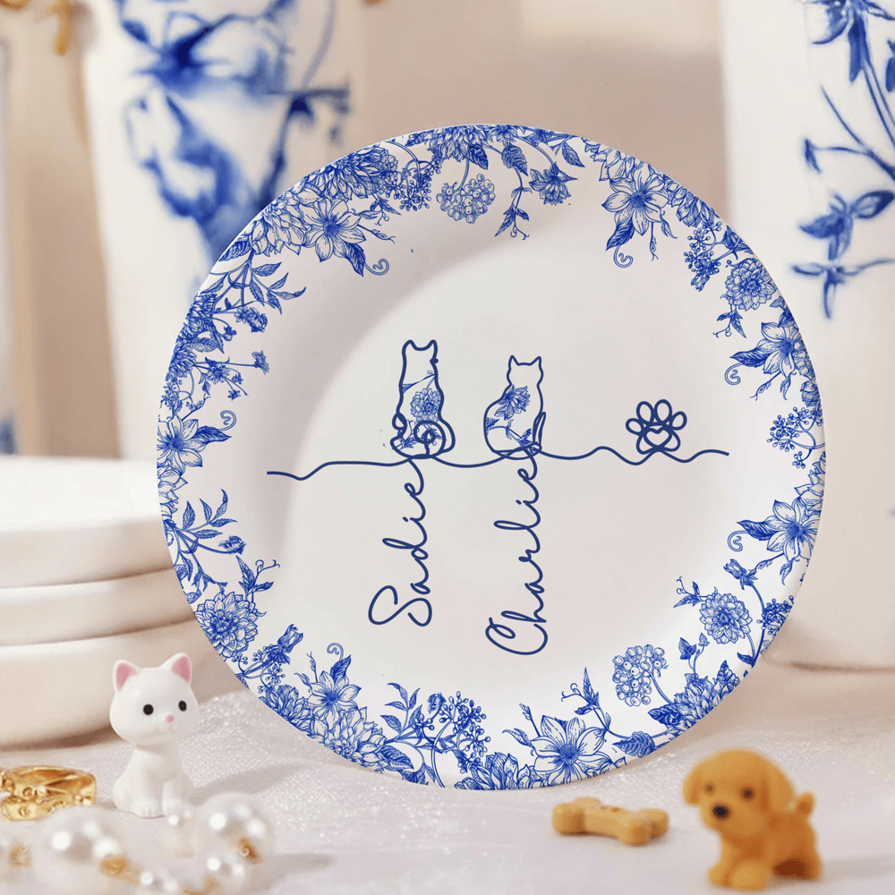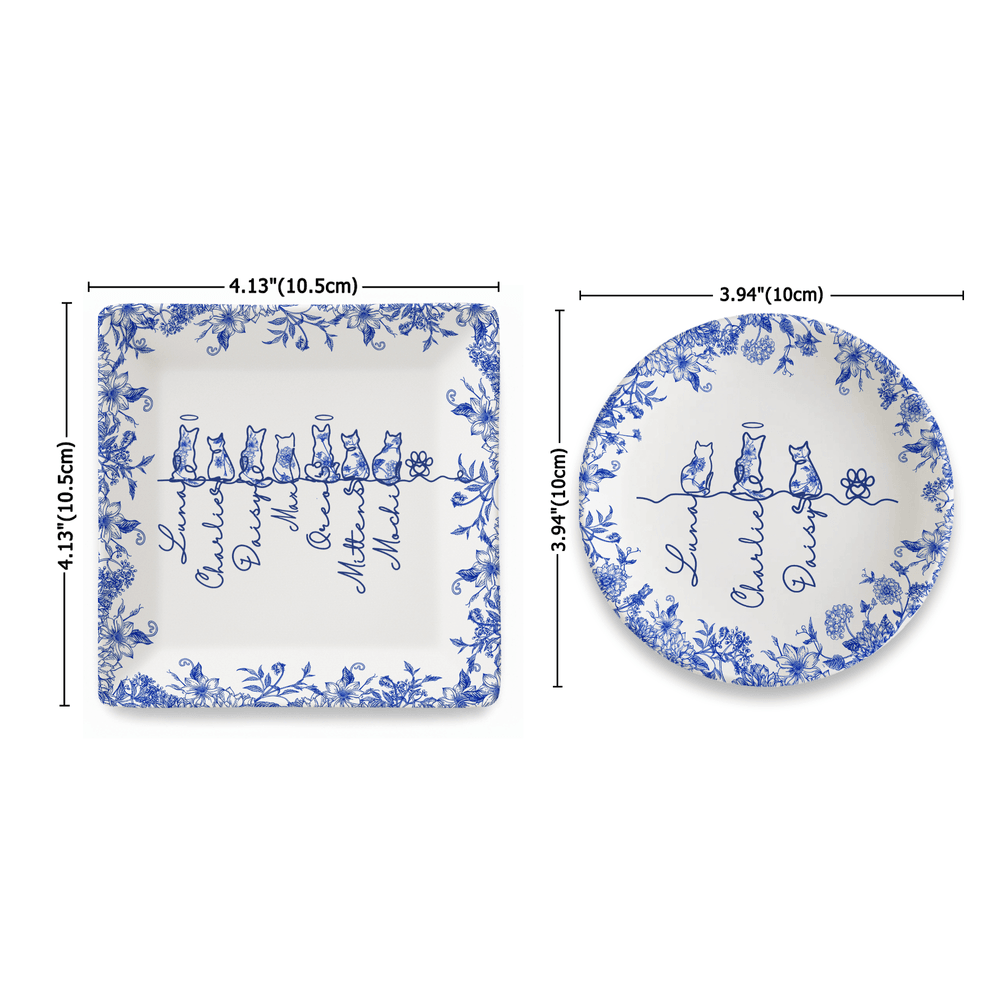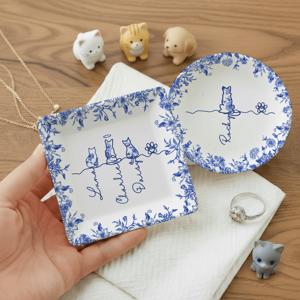 The jewellery dish features a classic Toile De Jouy pattern as its base, with intricate designs exuding an elegant vintage charm. It also supports customization with silhouette outlines of 1 to 7 cats or dogs, paired with each pet's unique name, deeply connecting the pet's image with the owner's cherished memories.