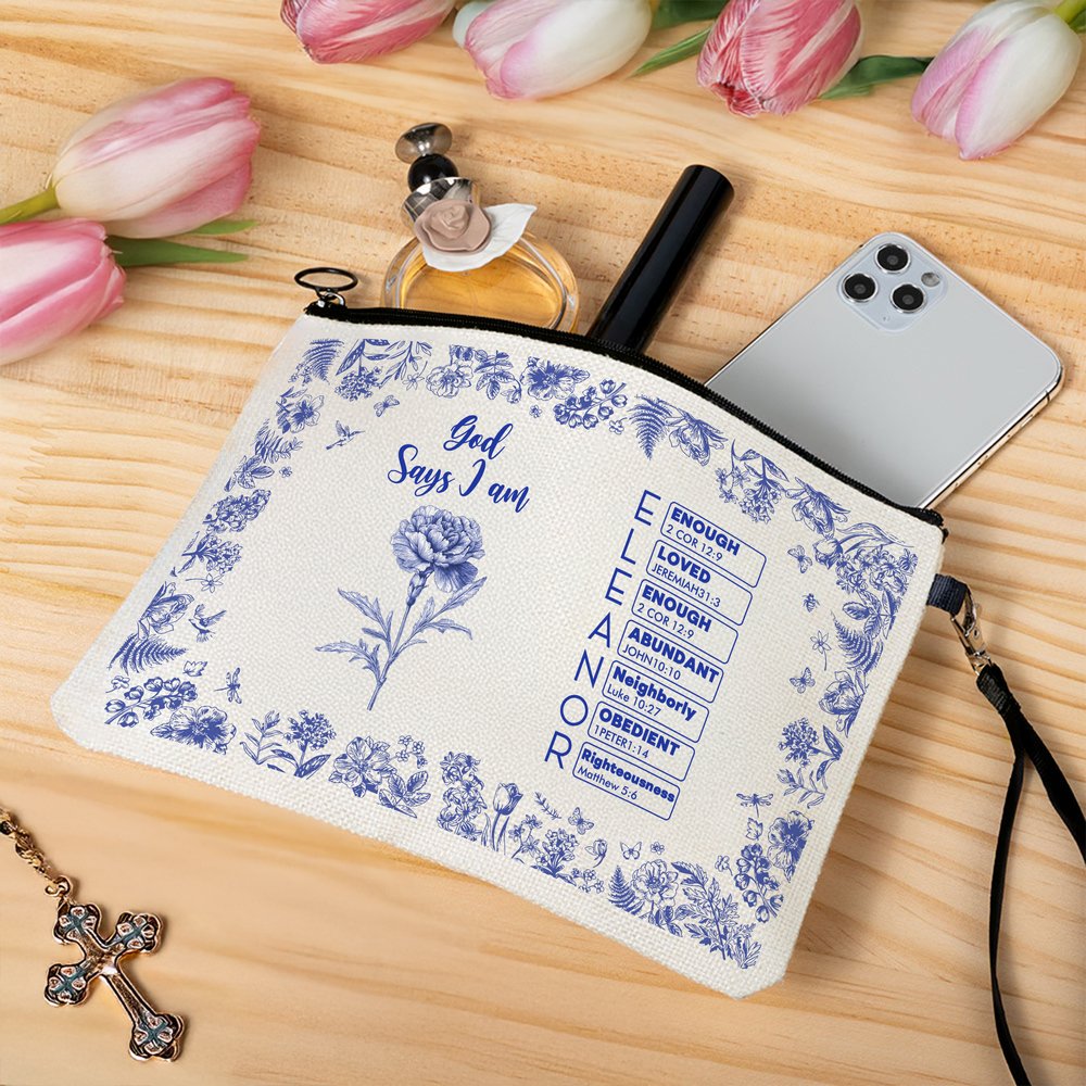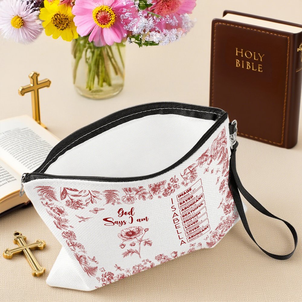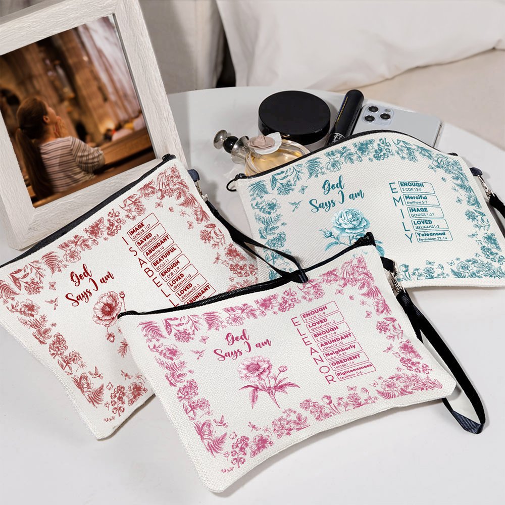 Our makeup bag features a timeless and versatile Toile de Jouy style, exuding a vintage and artistic feel. Choose from 24 elegant birth flowers and customize your name, each letter corresponding to a Bible verse, showcasing your personality and faith.