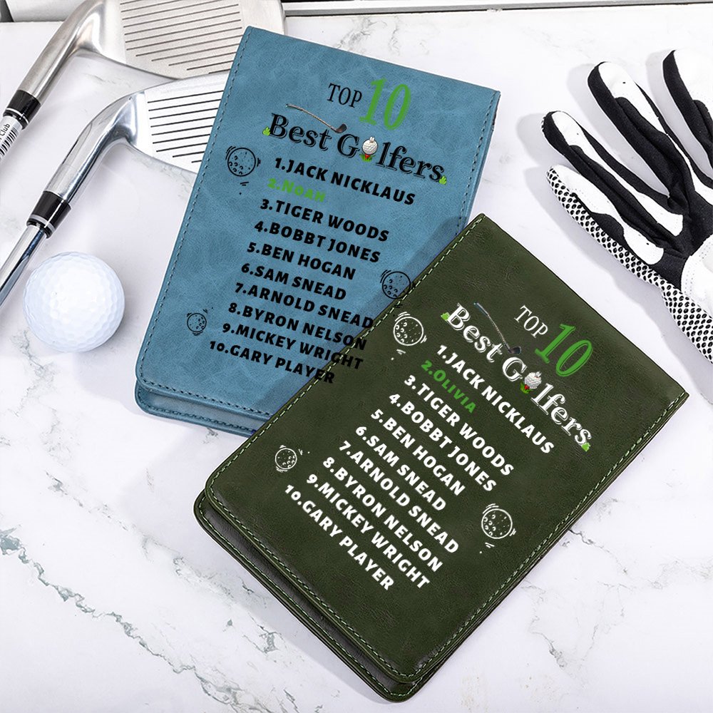 This golf scorecard holder has a fun "Top 10 Golfers" theme and adds a humorous twist to your golfing accessories. With the option to customize your name in the second spot, it’s a playful and unique way to showcase your love for the sport and your golfing prowess.