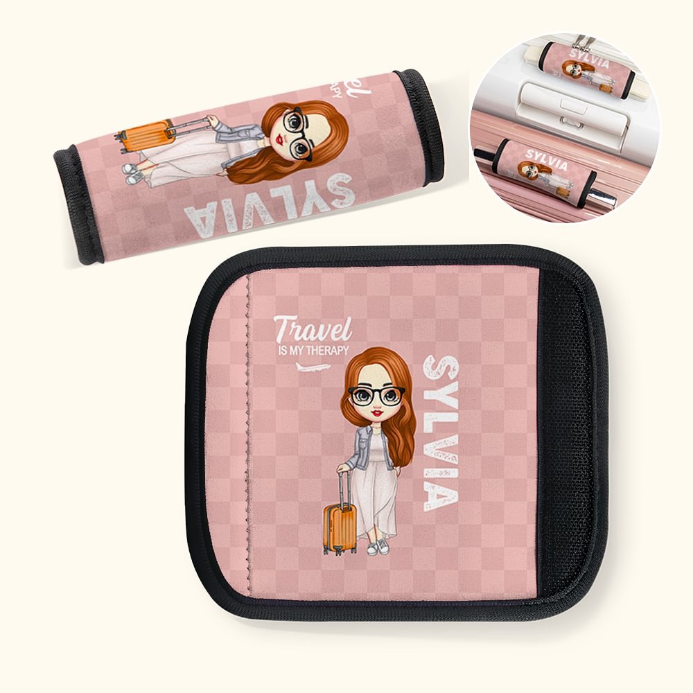 Personalised Travel Is My Therapy Cartoon Character Set of 2 Luggage Handle Wraps with Name and Contact Card Travel Accessories Gift for Travel Lovers