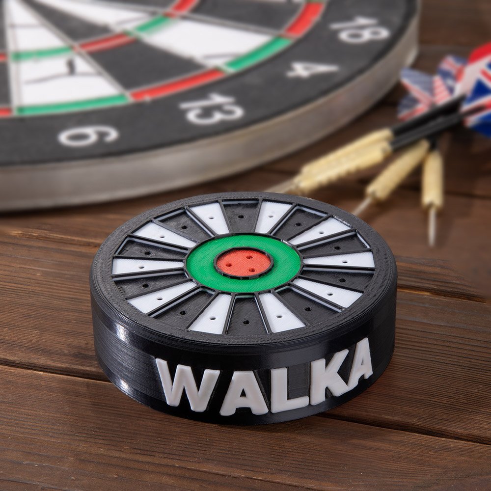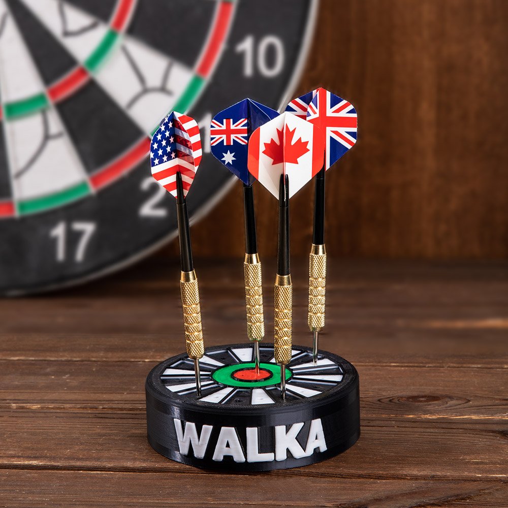 The excitement of the game night with friends; a custom-named dart holder will be the centre of attention as players prepare for an exciting match, the dart holder not only serves as a storage solution but is also comfortable to hold Taking pride of place in the hand or next to the dartboard, it also serves as an expression of player identity, with the player's name boldly emblazoned on the base, reflecting the player's spirit and style.