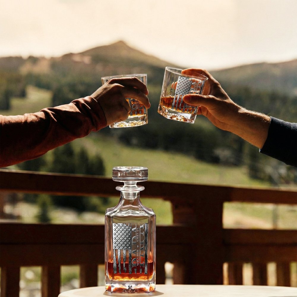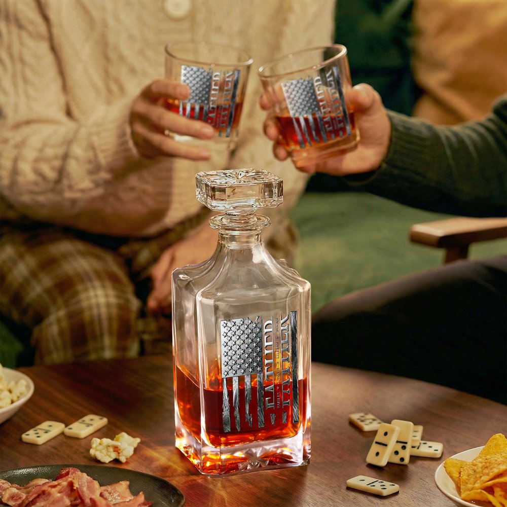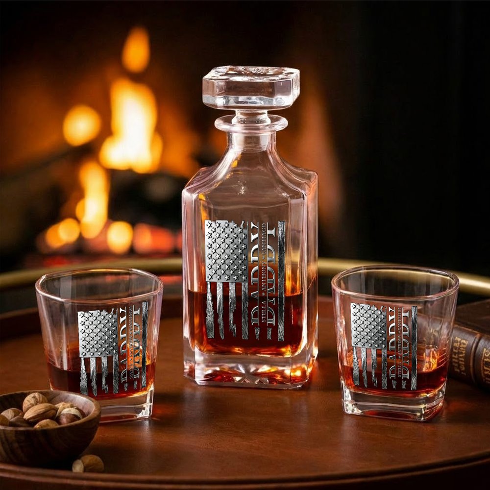 This decanter is centreed around American vintage style and family sentiment. It features an aged American flag design with star and stripe elements and a worn texture, exuding a vintage and rugged vibe. It can be customized with 1-6 names, perfectly blending with the flag pattern to highlight family identity and honor.
