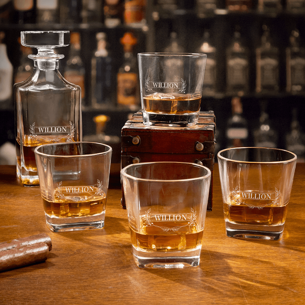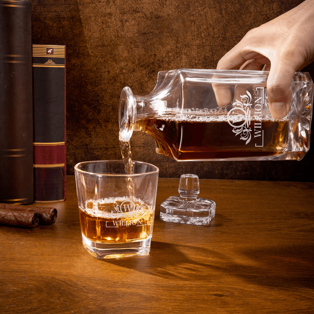 The decanter set features classic retro border engraving. Personalised text or initials are meticulously hand-engraved on the glass decanter and pinewood gift box, blending elegant style with exclusive commemorative value to create an artistic wine set worthy of being passed down through generations.
