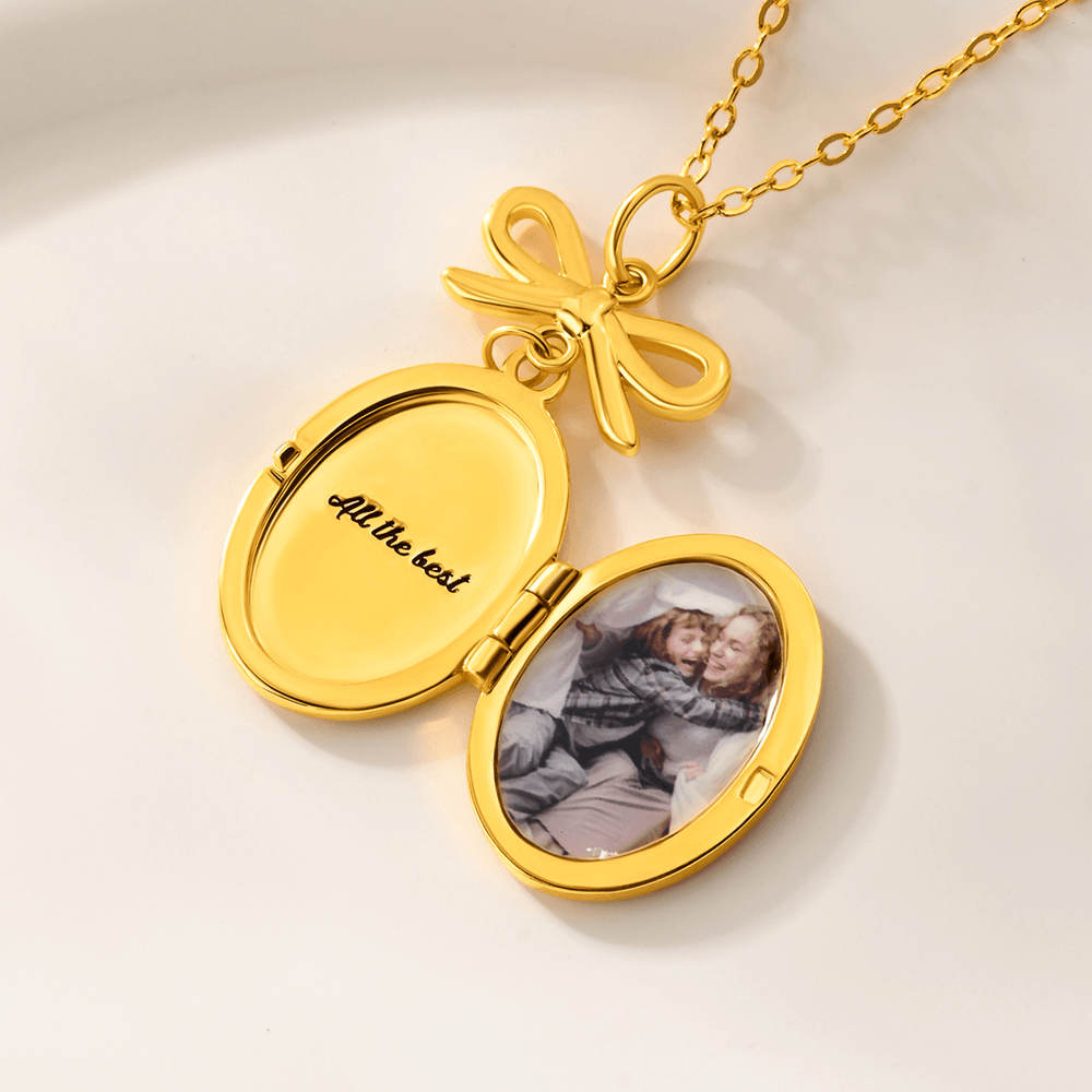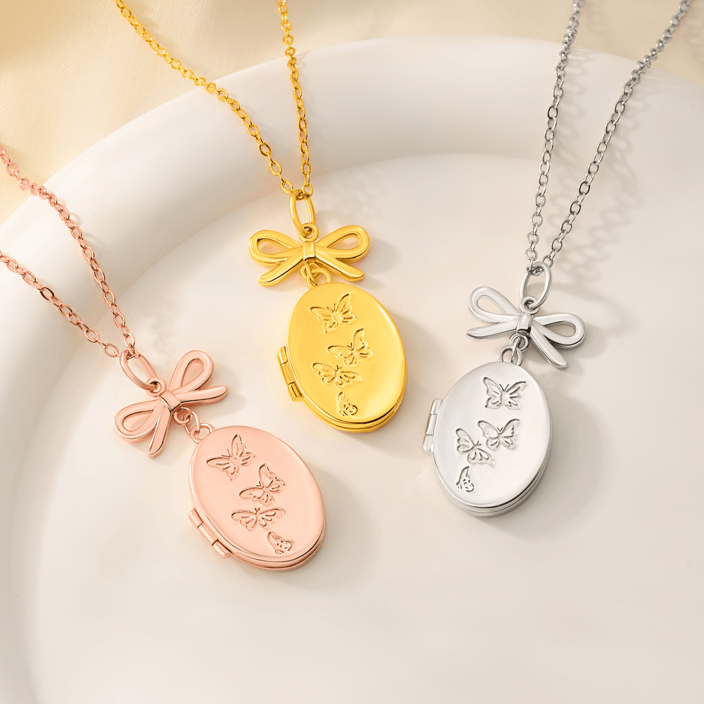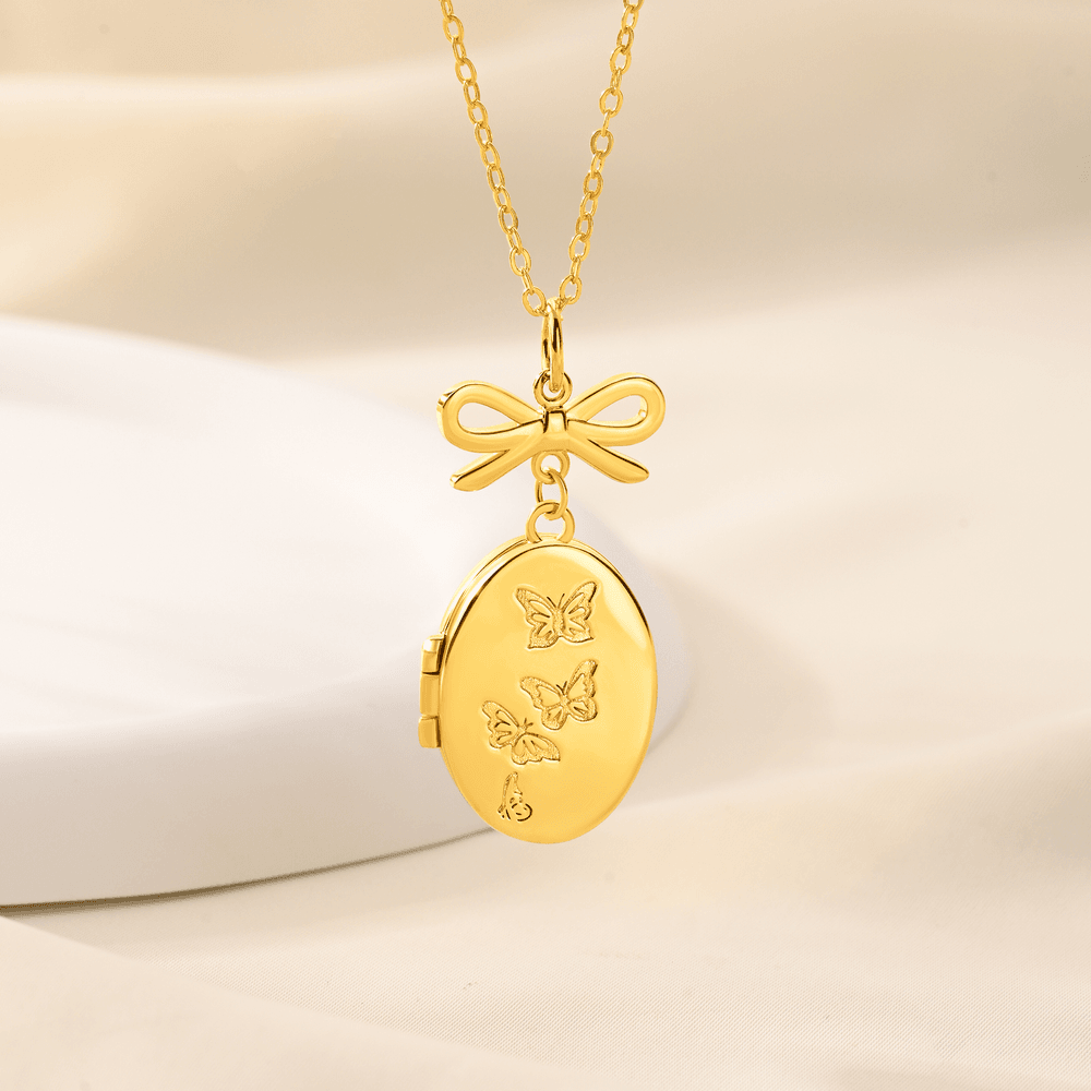 Delicate butterflies gracefully dance across the oval locket, symbolizing transformation, freedom, and beauty. The elegant bow detail and slim chain create a feminine butterfly locket necklace, while the inner space and engraving area allow you to add a custom photo and text for a truly personalised locket necklace that elevates both everyday and dressy looks.