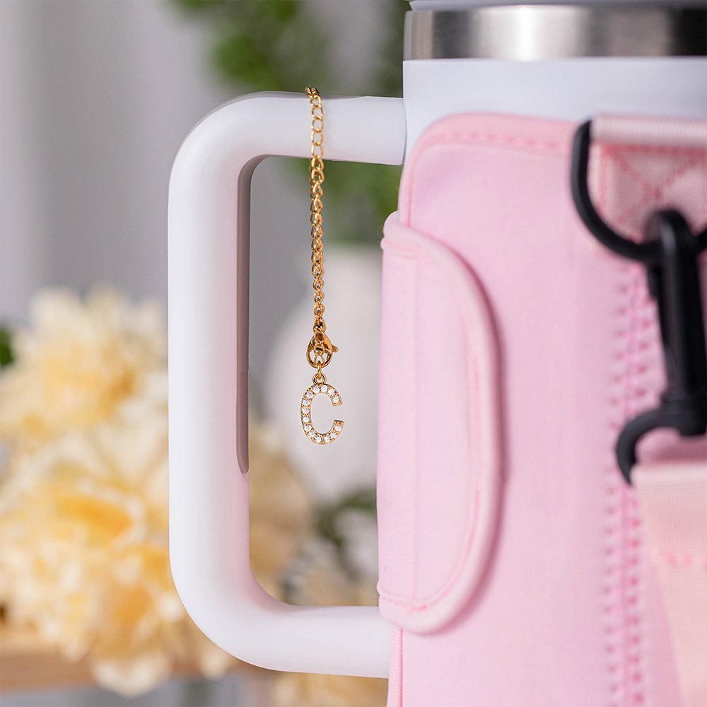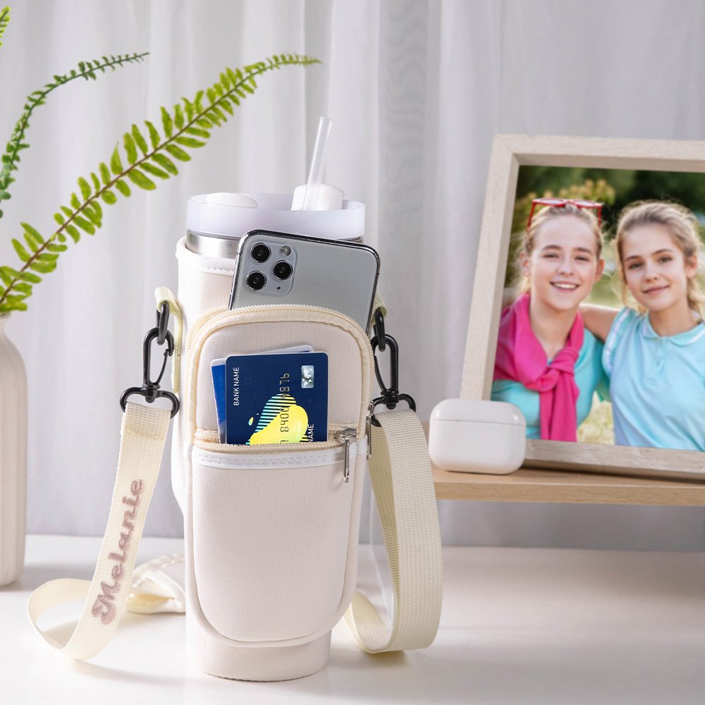 This water bottle carrier bag is equipped with an adjustable shoulder strap that can be embroidered with a special text, making it a unique accessory tailored just for you. The added letter pendant that hangs from the bottle handle adds an extra touch of individuality and style.