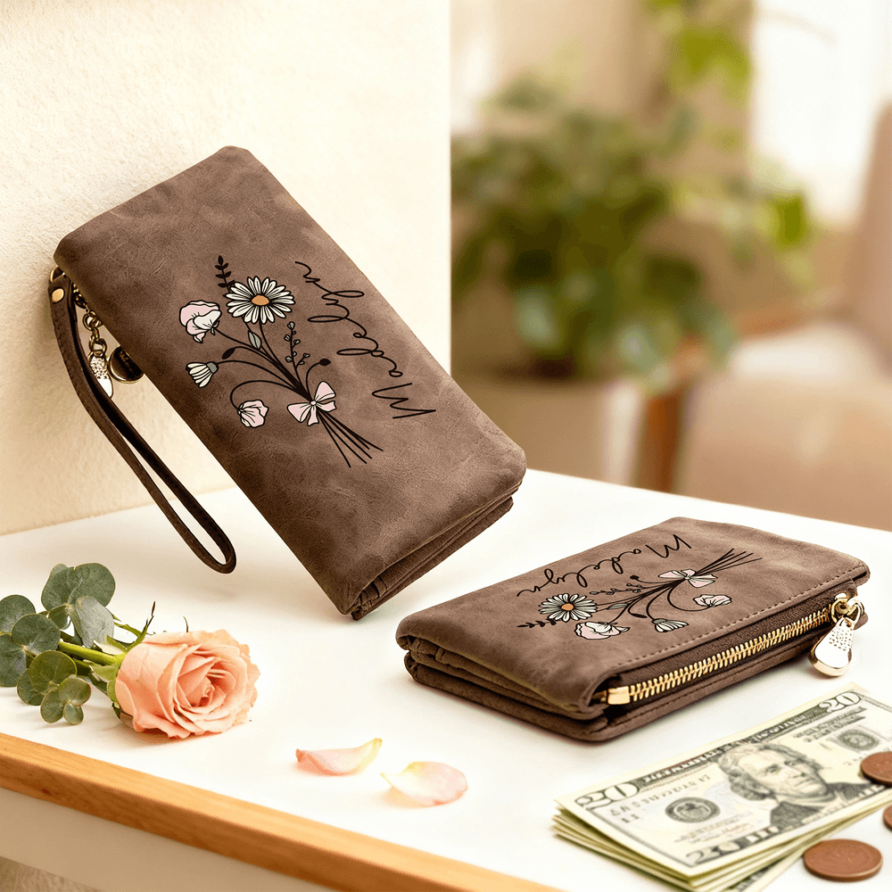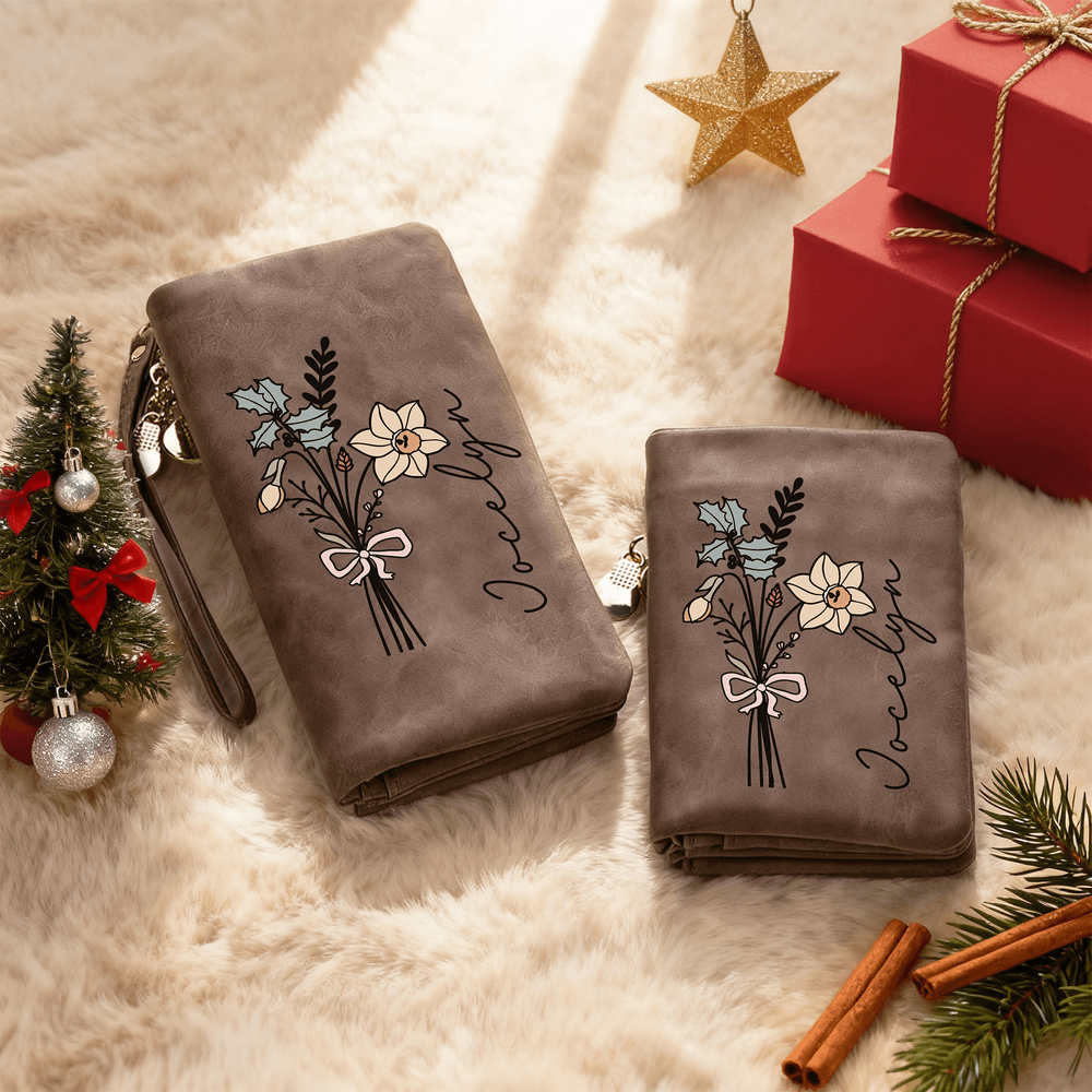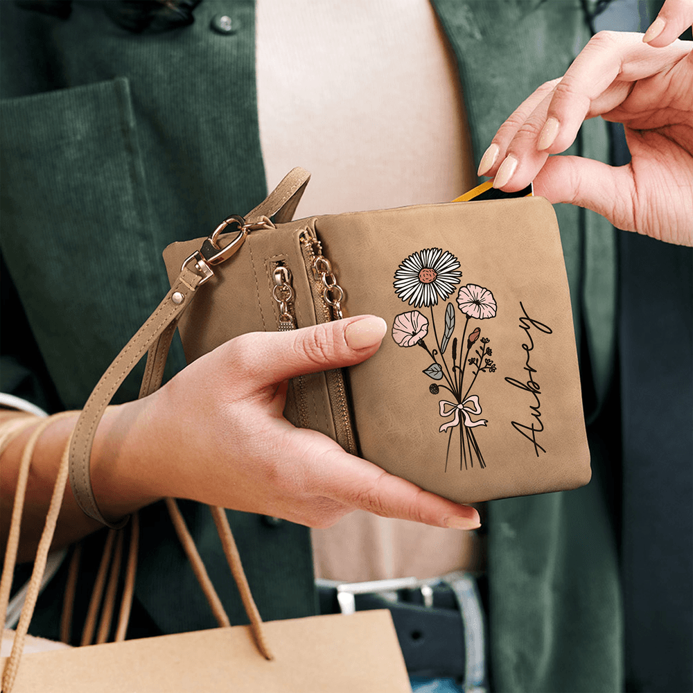 Personalised Watercolour Birth Flower Bouquet PU Leather Wallet with Name and Wristlet Christmas Birthday Gift for Women Girls