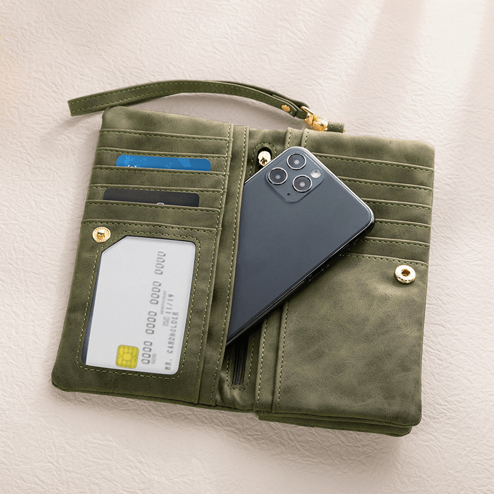 Crafted from high-quality PU leather, the material is soft and skin-friendly, resistant to wear and deformation even with long-term use. It includes multiple card slots, small zippered pockets for coins, a wrist strap, a full-length banknote compartment, and a large-capacity zippered pocket, ensuring organization anytime, anywhere.