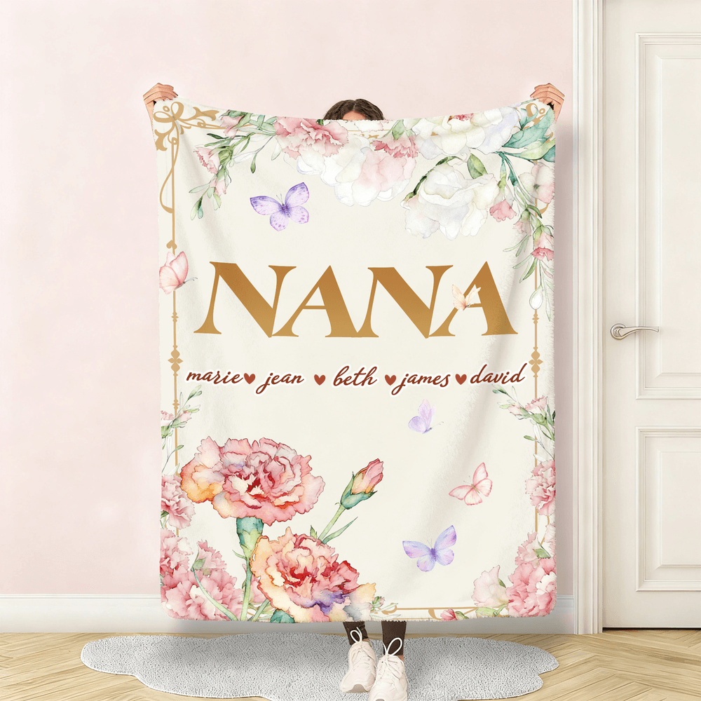 Features a watercolour-style birth flower theme paired with the title "Mama" or "Nana," customized with 1–10 children’s names and delicate heart elements, creating a meaningful design that celebrates family love and connection.