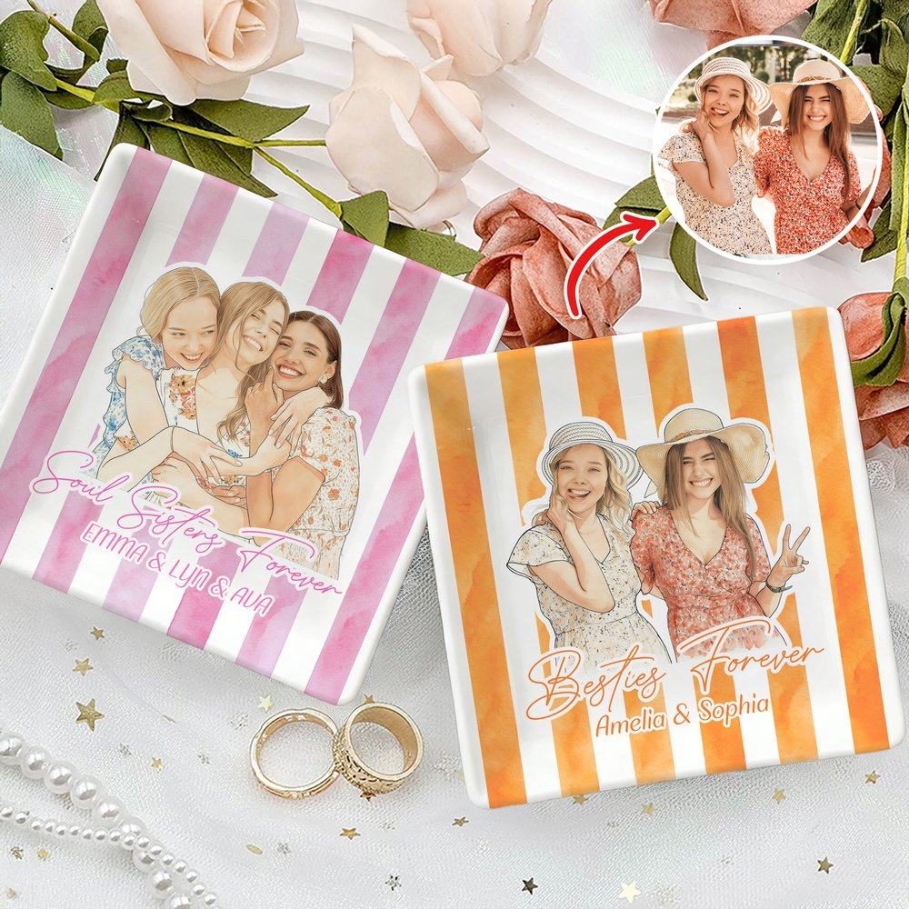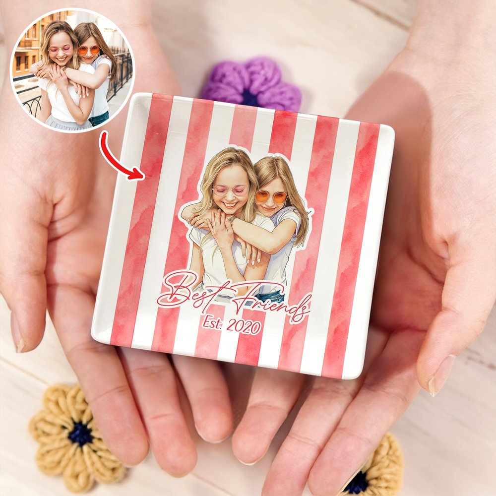 A watercolour-style striped companion portrait jewellery dish featuring a “photo likeness + personalised name.” The fresh, warm aesthetic blends practicality with sentimental value, creating a meaningful and customized home accessory.