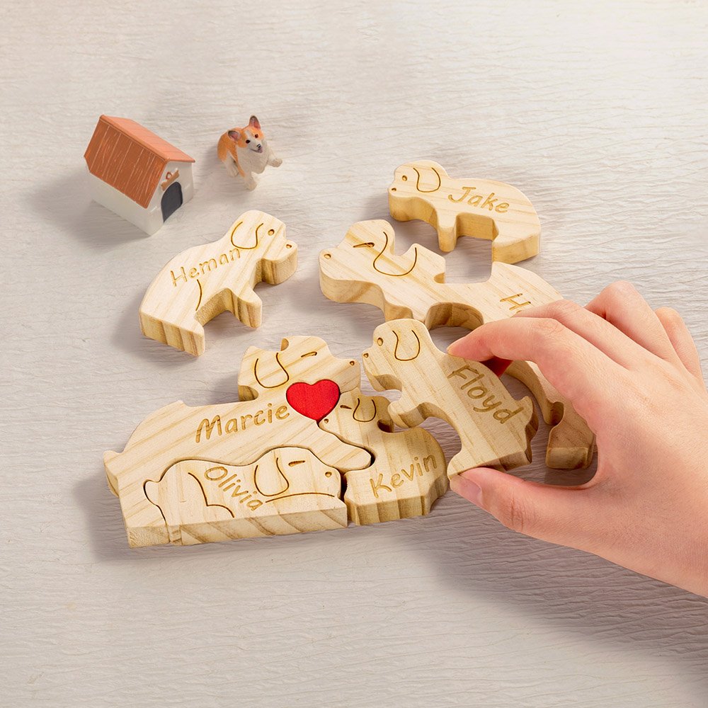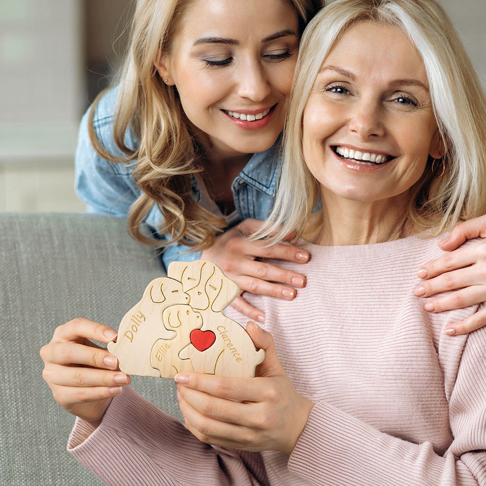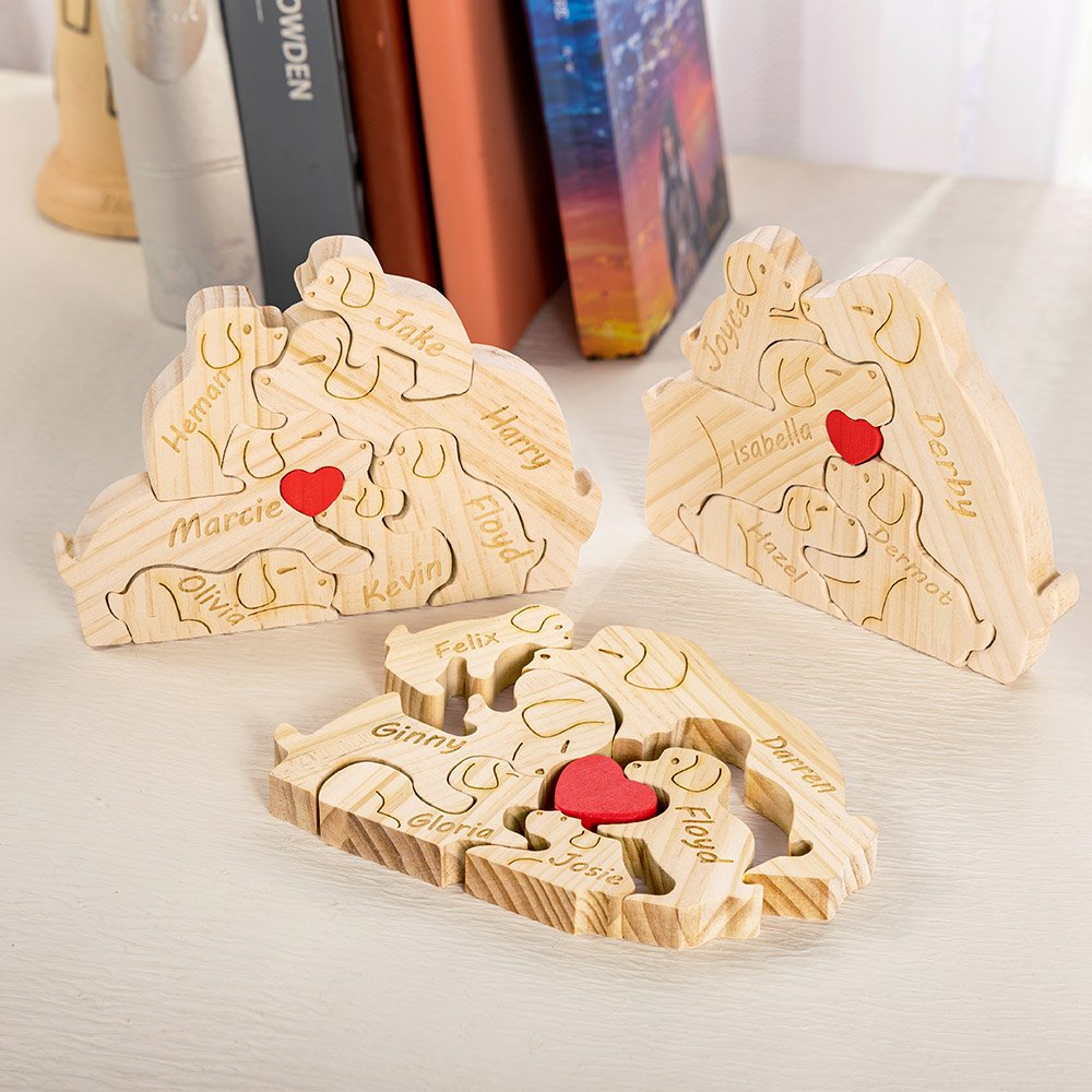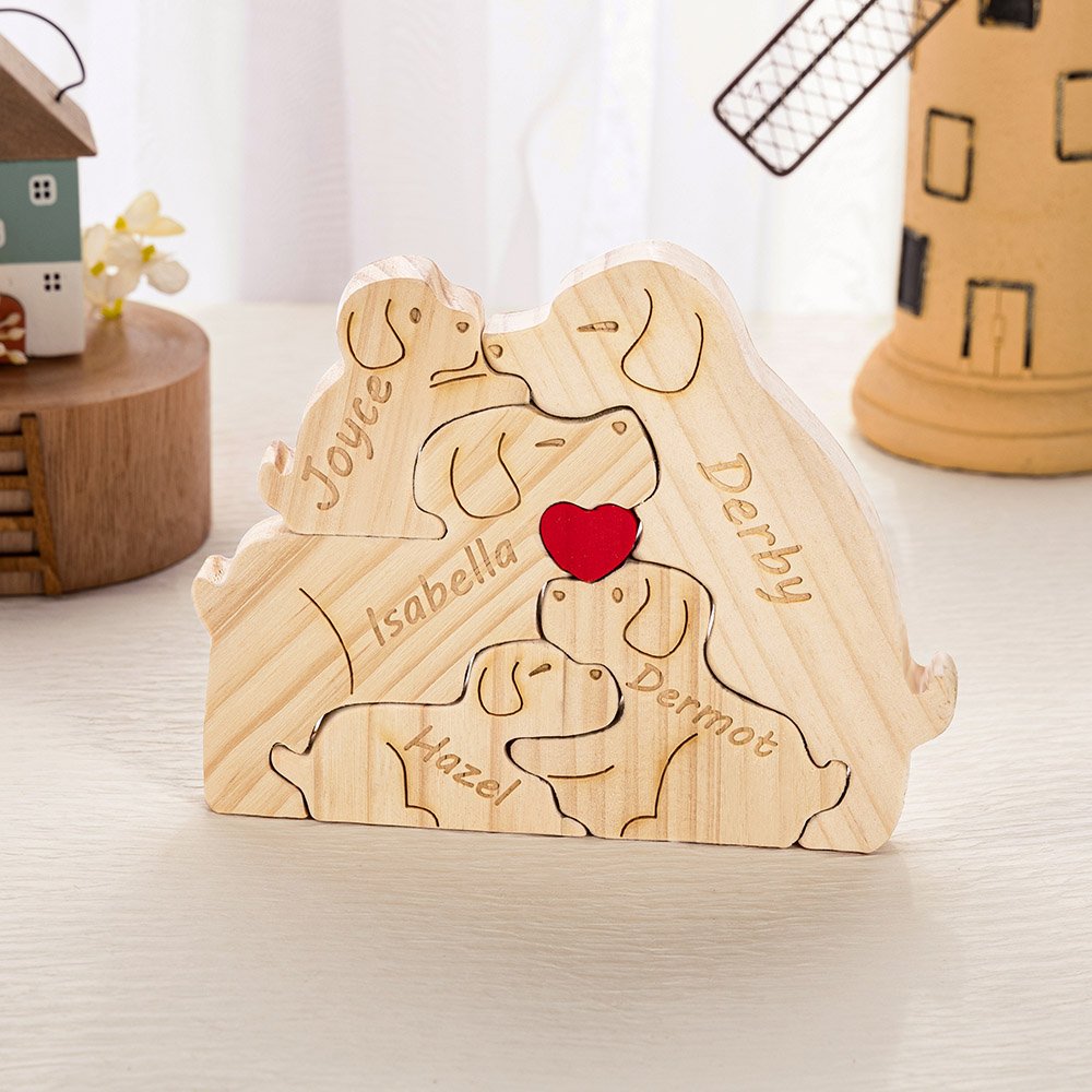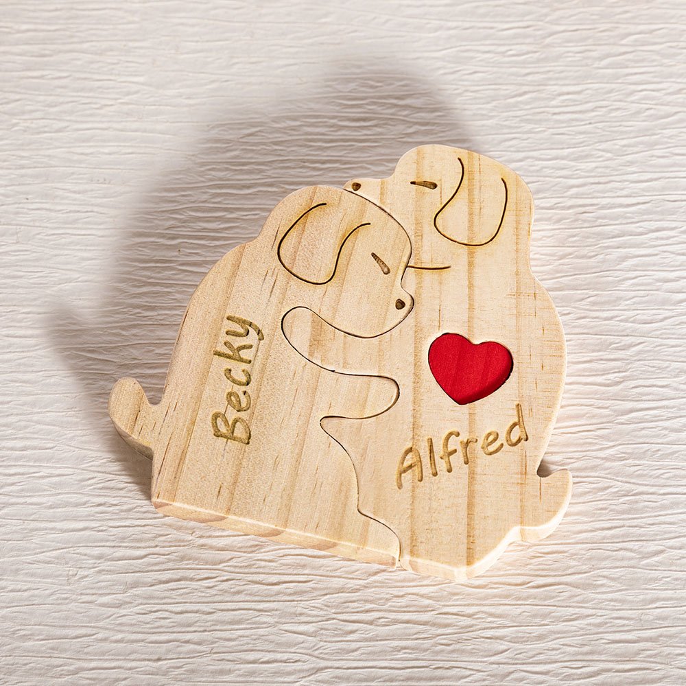 This wooden puzzle features embracing dogs with a red heart in the middle, symbolizing a loving family. You can customize 2-7 names to remind you that love and support unite your family in good times and bad.