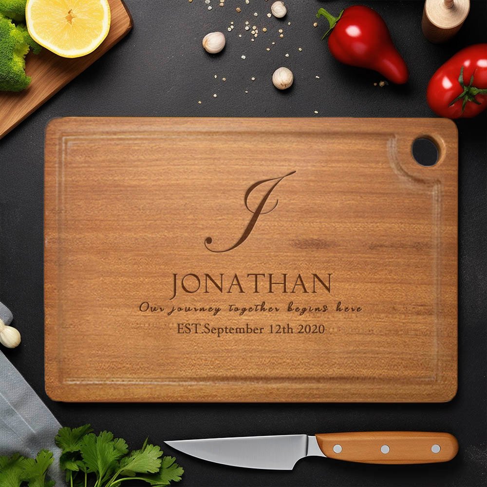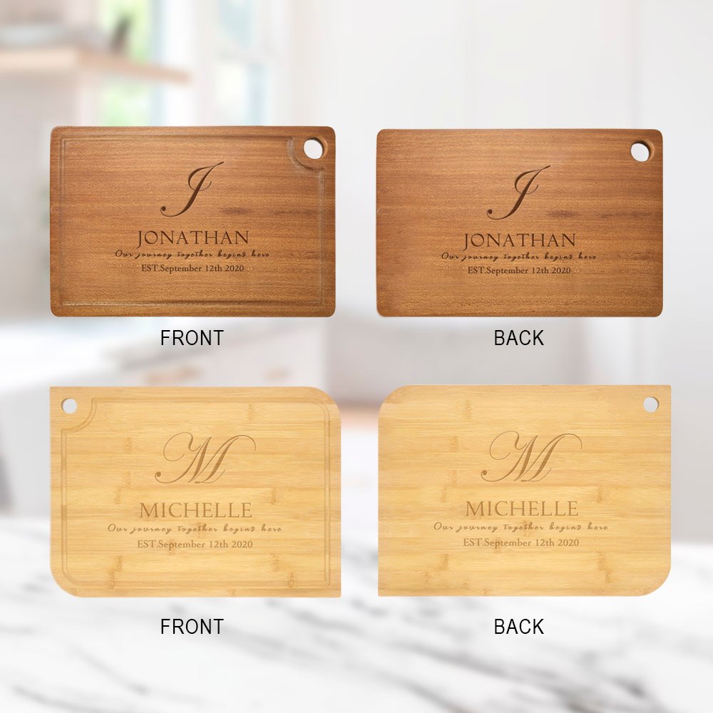 The Personalised chopping boards feature our exclusive designs with initials and last name ready to be customized by you. Choose from phrases such as "The heart of a happy home is family", "Our journey together begins here", "Where our story begins", or input your own text.