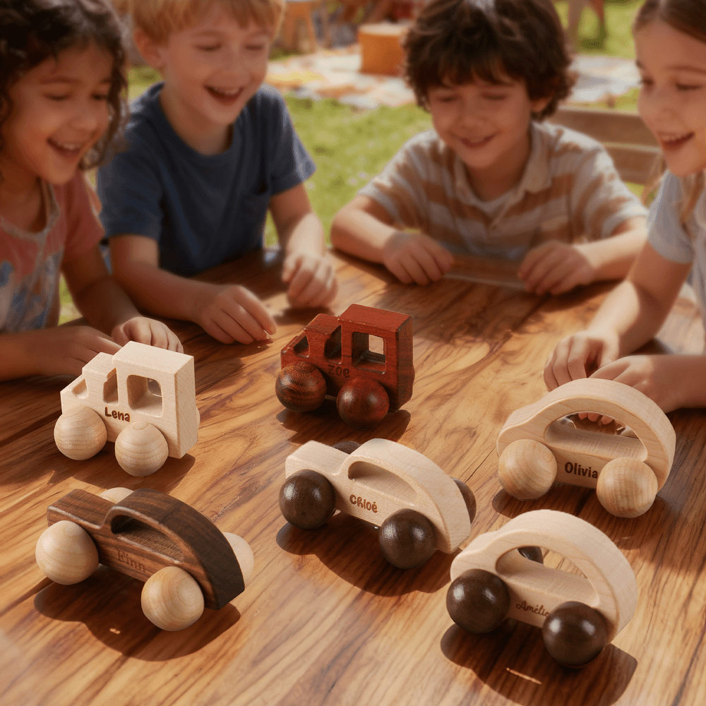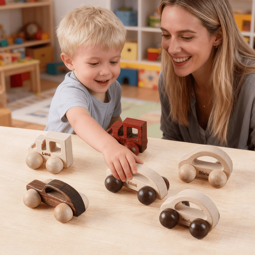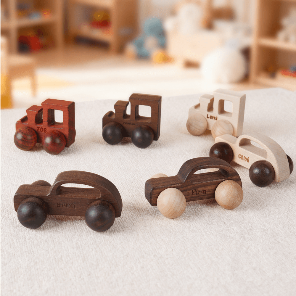 Featuring adorable car and train toys at their core, these toys retain the natural texture and warm feel of wood, showcasing a simple and rustic aesthetic. They also support name customization, making each toy a unique companion for your child.