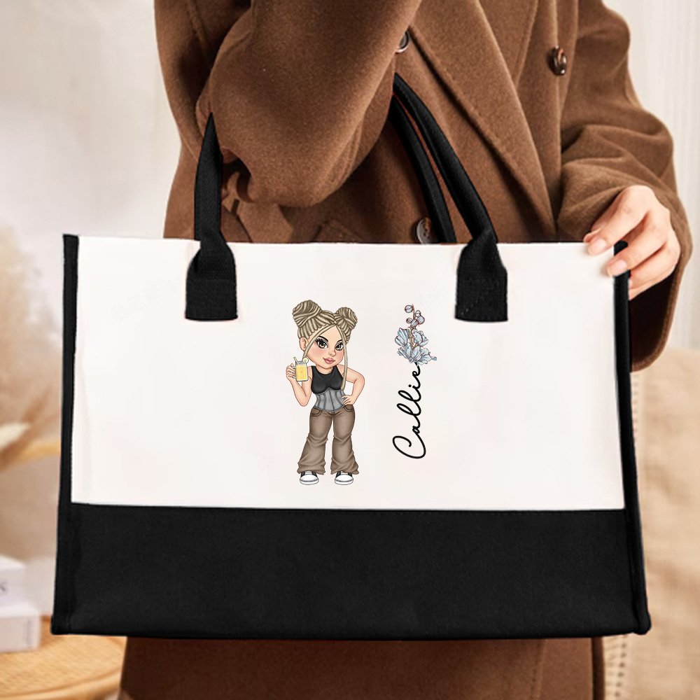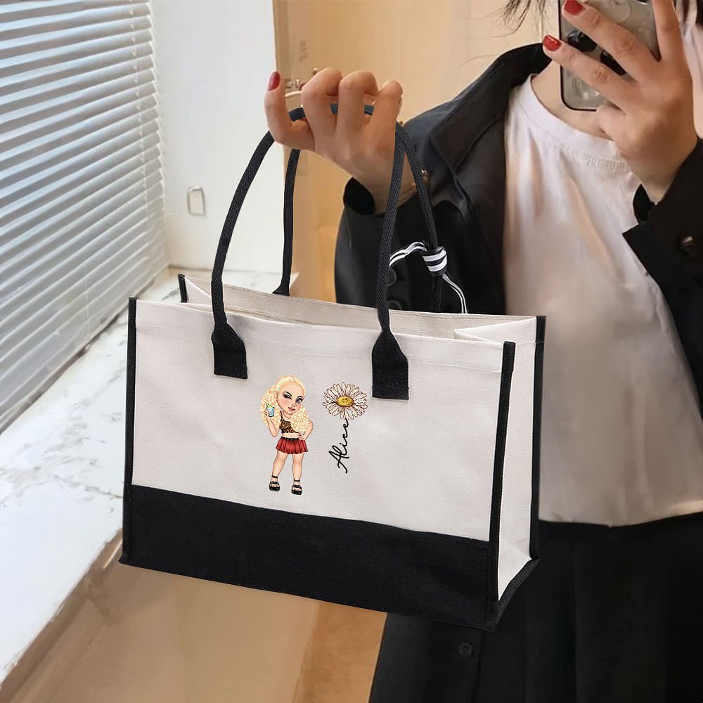 Embrace the Y2K fashion trend with this unique tote bag, featuring a charming cartoon character design. Personalise it with Y2K-style imagery, a custom name, and a birth flower based on your birth month. This customization makes it a standout accessory that reflects your style and significance.