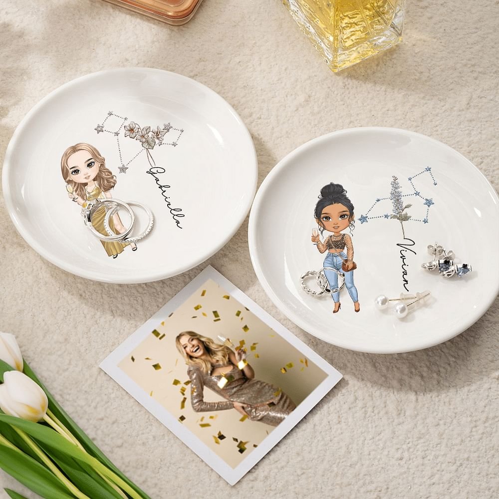 Featuring a stylish cartoon woman, the unique ceramic jewellery plate is paired with a birth flower and constellation pattern. Each design is unique and is an outstanding accessory for any woman. The ceramic jewellery plate can also be further Personalised with a name, making it a special keepsake for the owner.