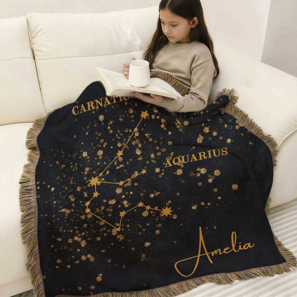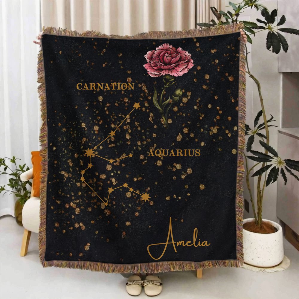 This tassel blanket perfectly blends mysterious constellation patterns with elegant birth flowers. Against a backdrop of a deep night sky, constellation lines and golden stars are interspersed, complemented by beautiful flowers symbolizing birth dates, creating an overall romantic and dreamy atmosphere. The blanket can also be customized with your name, making each piece a unique work of art.