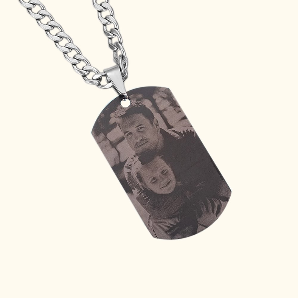 Capture your most cherished memories with this custom photo pendant feature. Simply upload your favorite photo, whether it's a picture of a loved one, a beloved pet, or a special moment, and we will expertly engrave it onto the dog tag pendant. Every glance at this necklace will evoke a flood of emotions and serve as a constant reminder of those dear to your heart.